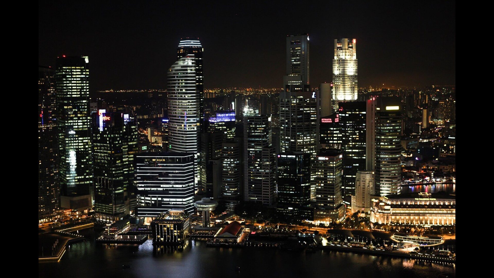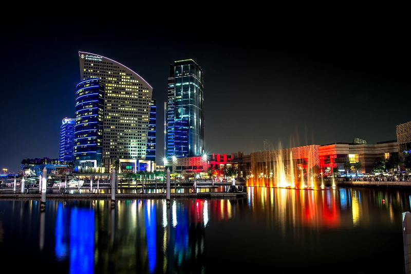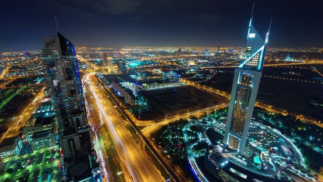 A night-time view of Dubai, United Arab Emirates, featuring the Burj Khalifa and the Emirates Towers
